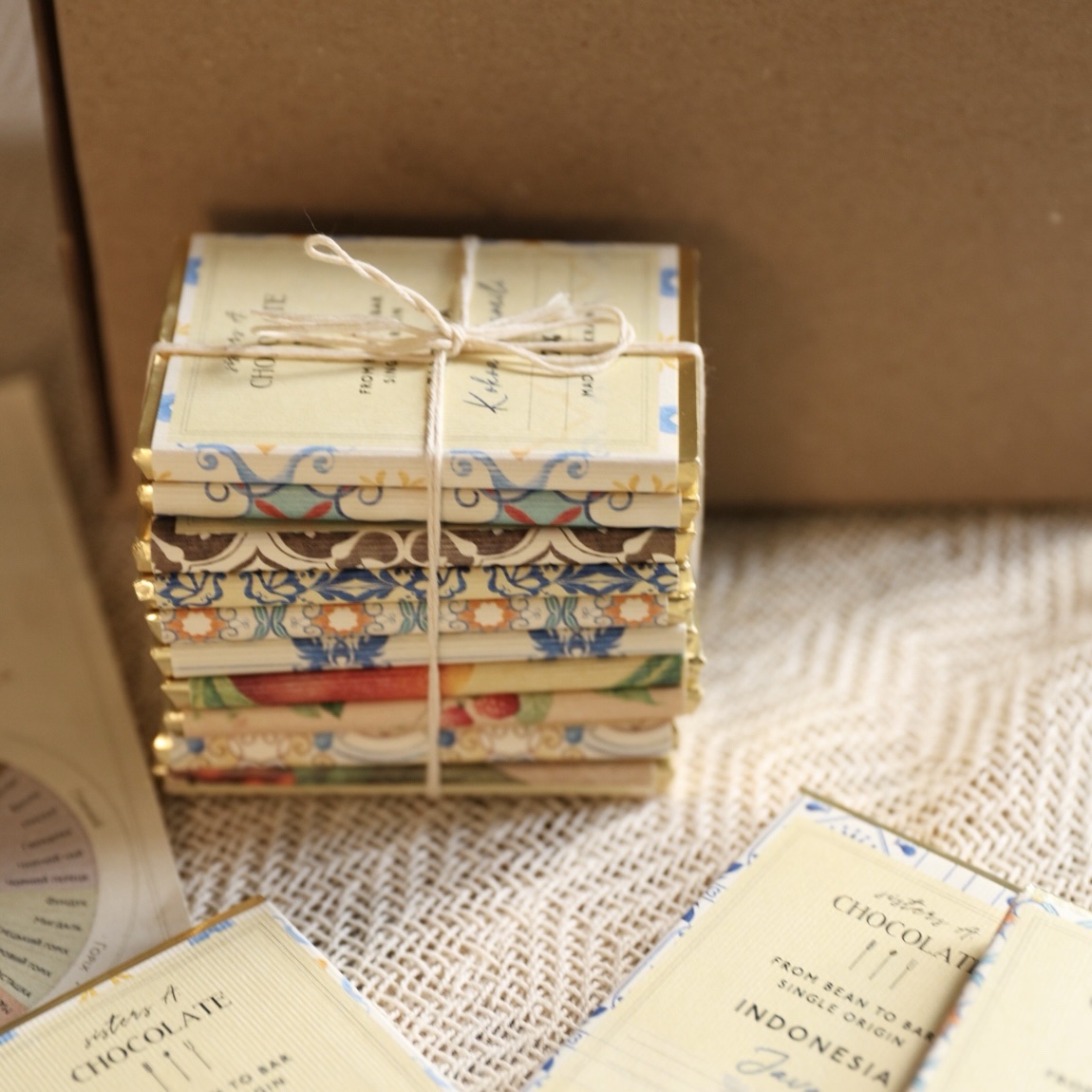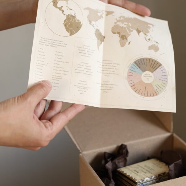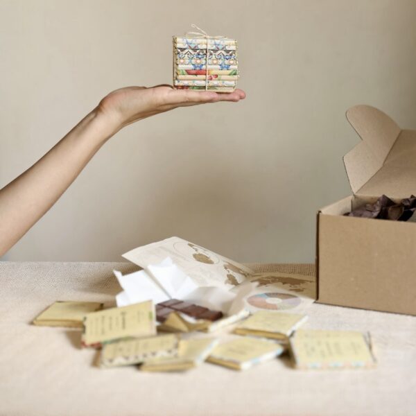 У дегустаційний набір входить 10 плиток шоколаду (по 22 г) з какао-бобів різних країн: